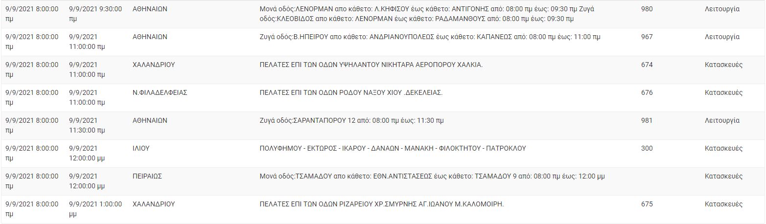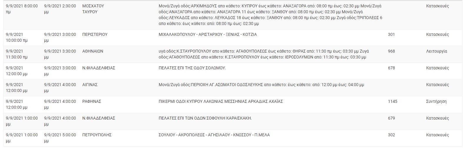 Διακοπή ρεύματος έχει προγραμματίσει για σήμερα, Πέμπτη, 9 Σεπτεμβρίου, ο ΔΕΔΔΗΕ, σε αρκετές περιοχές της Αττικής, ανάμεσά τους το Κέντρο της Αθήνας, τη Νέα Φιλαδέλφεια και το Μοσχάτο.