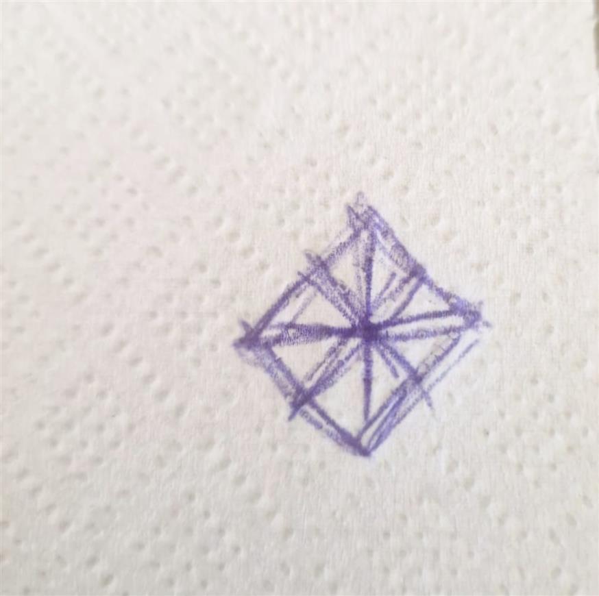 Το σχήμα που φαίνεται στη φωτογραφία είναι ένα συμμετρικό, γεωμετρικό σχέδιο, φτιαγμένο με μολύβι ή στυλό πάνω σε χαρτοπετσέτα. Πρόκειται για έναν ρόμβο που έχει διαμεριστεί εσωτερικά με ευθείες που συγκλίνουν στο κέντρο, δημιουργώντας μια εντύπωση ροζέτας ή αστεριού. Έχουν χρησιμοποιηθεί αρκετές γραμμές, ορισμένες ενισχυμένες, με έμφαση στις γωνίες και στη συμμετρία.