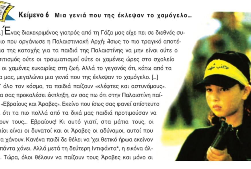 Στο πλαίσιο αυτό αφαίρεσαν από το βιβλίο της Νεοελληνικής Γλώσσα της Γ' Γυμνασίου άρθρο του δημοσιογράφου Πέτρου Παπακωνσταντίνου με τίτλο «Μια γενιά που της έκλεψαν το χαμόγελο...» και το οποίο αναφέρεται στην Ιντιφάντα. Το άρθρο αυτό αντικαταστάθηκε με ένα άλλο «λάιτ» κείμενο το οποίο δημιουργήθηκε, όπως αναφέρεται μέσω εφαρμογής Τεχνητής Νοημοσύνης, και έχει τίτλο «Τα παιδιά μπορεί να μεγαλώνουν διαφορετικά». Η κίνηση αυτή σίγουρα δεν είναι πρωτοφανής αφού πολλές φορές αφαιρούνται κείμενα από τα σχολικά βιβλία γιατί δεν «βολεύουν» γιατί οι πολιτικές, κοινωνικές ή διεθνείς συγκυρίες έχουν διαφοροποιηθεί. Το άρθρο πάντως που αφαιρέθηκε δεν είχε κάποιο «πολιτικό χρώμα», αντίθετα ήταν ένα λογοτεχνικό κείμενο του παρουσίαζε την καθημερινότητα των παιδιών σε μια εμπόλεμη ζώνη. Όπως λένε οι εκπαιδευτικοί «δεν αφαίρεσαν απλώς ένα κείμενο. Αφαίρεσαν το δικαίωμα των παιδιών να νιώσουν συμπόνια, να καταλάβουν πώς είναι να μεγαλώνεις μέσα σε ερείπια». Τελικά, το αρχικό κείμενο αντικαταστάθηκε με άλλο αδιάφορο κείμενο που θα μπορούσε να αφορά οποιοδήποτε μέρος του πλανήτη και τη ζωή των παιδιών σε συνθήκες πολέμου.