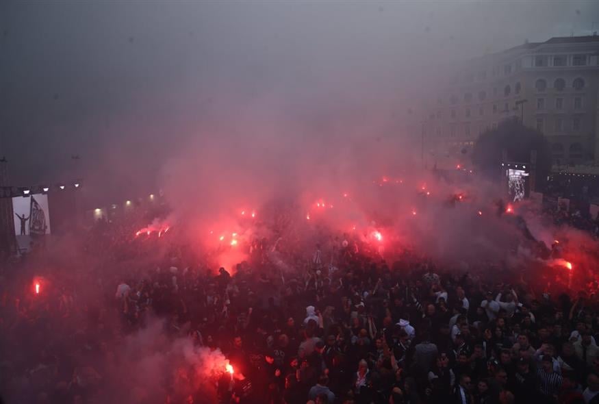 Νωρίτερα, στις 19:26 ακριβώς, η Πλατεία Αριστοτέλους μετατράπηκε σε ένα εκρηκτικό σκηνικό γιορτής για τον ΠΑΟΚ.