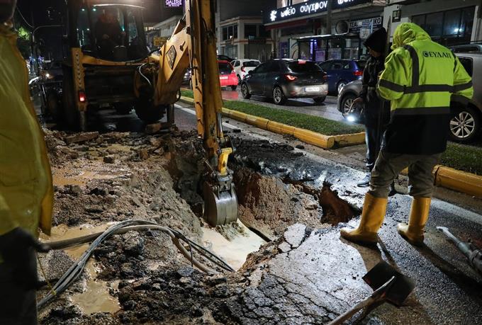 Στο σημείο επιχειρούν ήδη συνεργεία της ΕΥΔΑΠ με τη συνδρομή εκσκαφέα για την αποκατάσταση της ζημιάς
