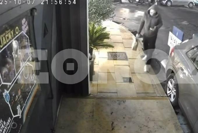 Η στιγμή που ένας από τους δράστες προσπαθεί να σπάσει τη βιτρίνα χρησιμοποιώντας τροχό, αλλά και χτυπώντας το τζάμι με γροθιές
