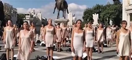 Οι εργαζόμενες του πρώην εθνικού αερομεταφορέα της Ιταλίας γδύθηκαν αργά και αθόρυβα, ρίχνοντας τις στολές τους στο έδαφος και παρέμειναν με τα μισοφόρια στο κέντρο της πλατείας