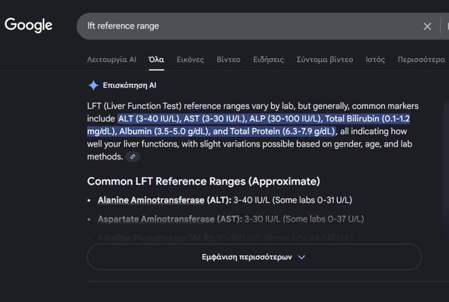 Όπως εξηγεί, οι εξετάσεις ηπατικής λειτουργίας αποτελούν σύνολο διαφορετικών αιματολογικών ελέγχων και η ερμηνεία τους είναι σύνθετη. «Οι AI περιλήψεις παρουσιάζουν απλώς λίστες αριθμών, χωρίς να προειδοποιούν ότι ακόμη και φυσιολογικά αποτελέσματα μπορεί να συνυπάρχουν με σοβαρή ηπατική νόσο. Αυτή η ψευδής αίσθηση ασφάλειας μπορεί να αποδειχθεί εξαιρετικά επιβλαβής», τονίζει.